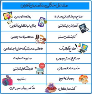 بر اساس نتایج جستجو، کسبوکارهای خانگی پردرآمد شامل خشک کردن میوه، فروش سبزیجات خرد شده، قالی بافی، بازاریابی تلفنی، عروسک سازی، شیرینی پزی، خیاطی، و صنایع دستی میباشند.